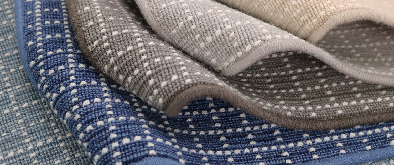This unique grid pattern is created by white loop dots against a darker wool field. Arlen has a color palette of neutrals and shades of blue.