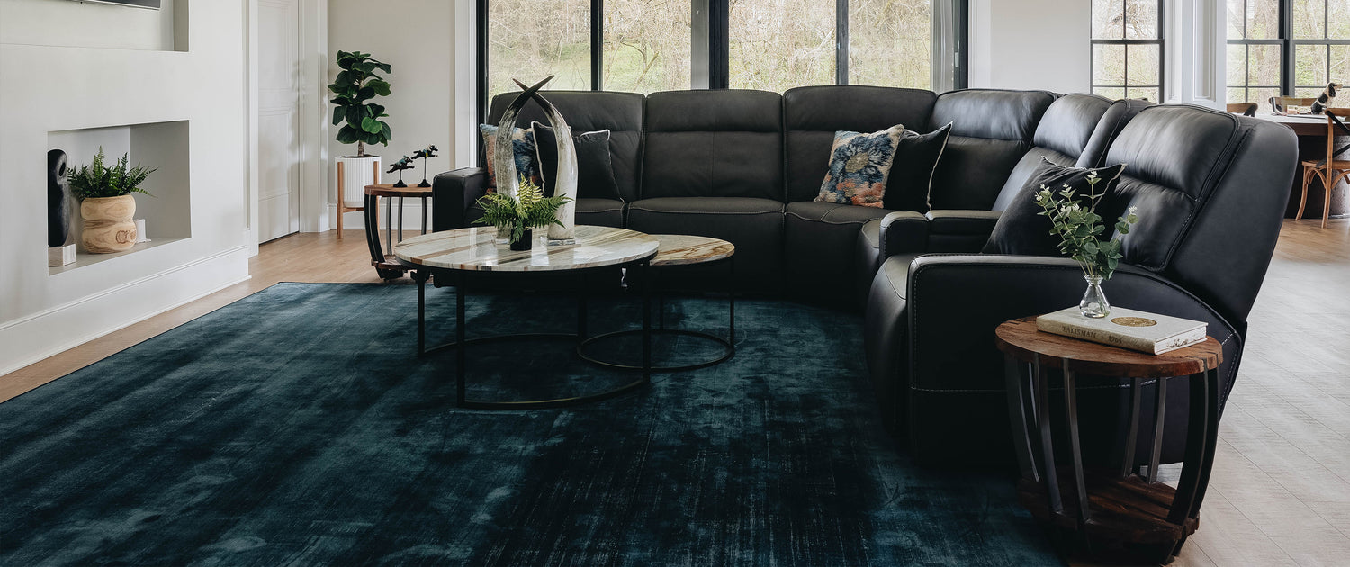 - Furnishings should sit partially or completely on the rug, while still allowing ample space to move in and out of the area. This usually means allowing 18”-24” of space between sofa and chairs or sofa and coffee table.