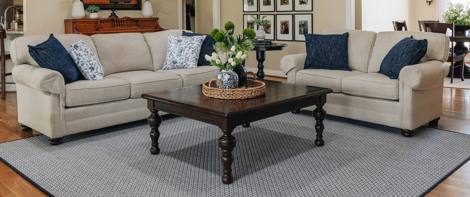 - Furnishings should sit partially or completely on the rug, while still allowing ample space to move in and out of the area. This usually means allowing 18”-24” of space between sofa and chairs or sofa and coffee table.