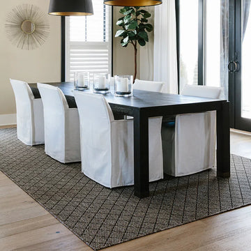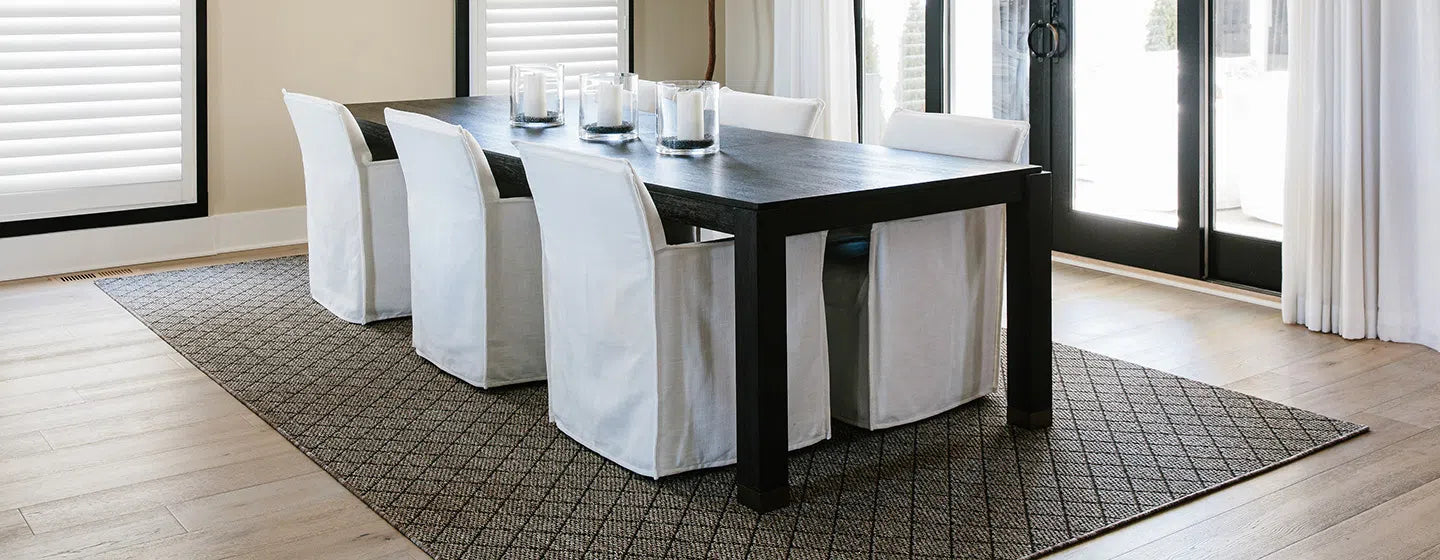 - The perfect size rug will allow the chairs to be accessed while all four legs stay on the rug. Depending on the scale of the chairs, 24”-36” of rug beyond the edges of the table is recommended.