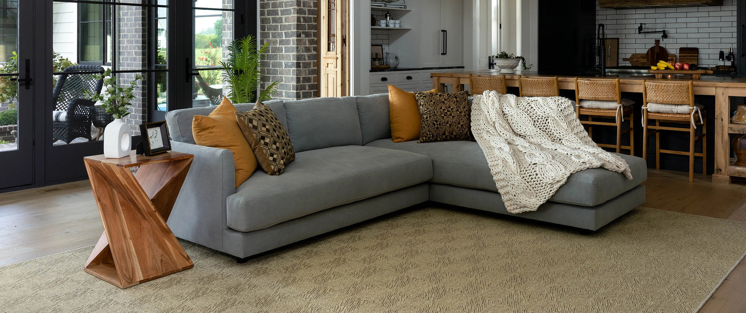 • Furnishings should sit partially or completely on the rug, while still allowing ample space to move in and out of the area. This usually means allowing 18”-24” of space between sofa and chairs or sofa and coffee table.