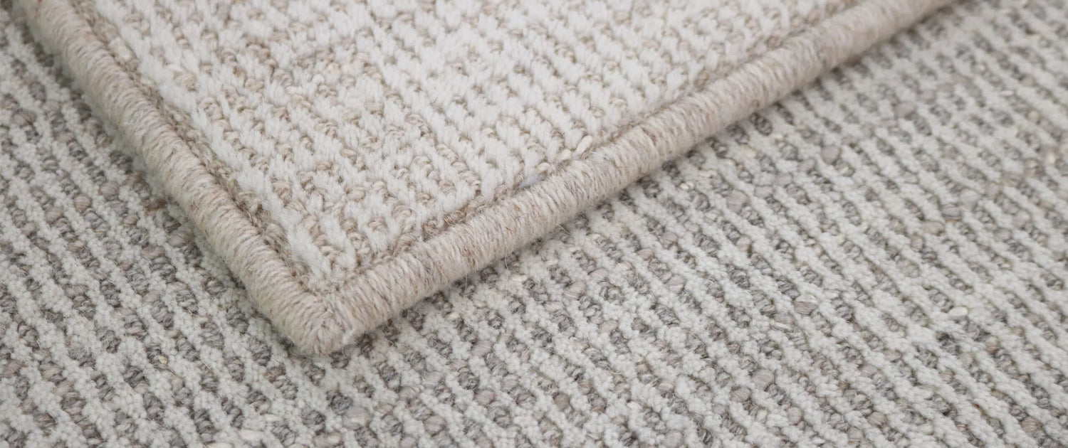 Ceremony is crafted with plush loops of striated linen nestled within an ivory wool field. The organic flow of color helps marry the wool and linen into a harmonious combination.