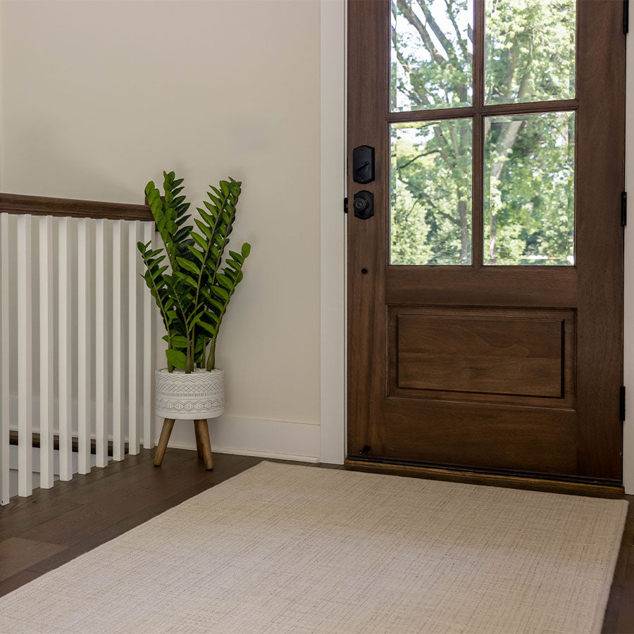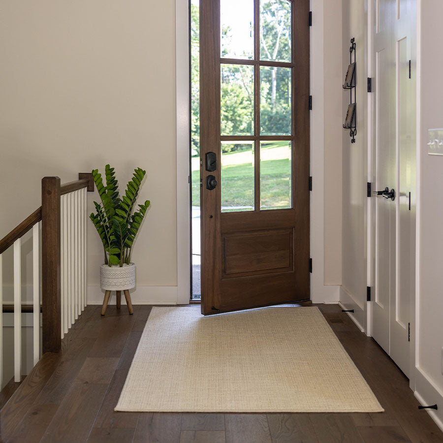 - Most entryway rugs allow for 18” of bare floor between rug and walls. Smaller entryways are limited to the width of the door.