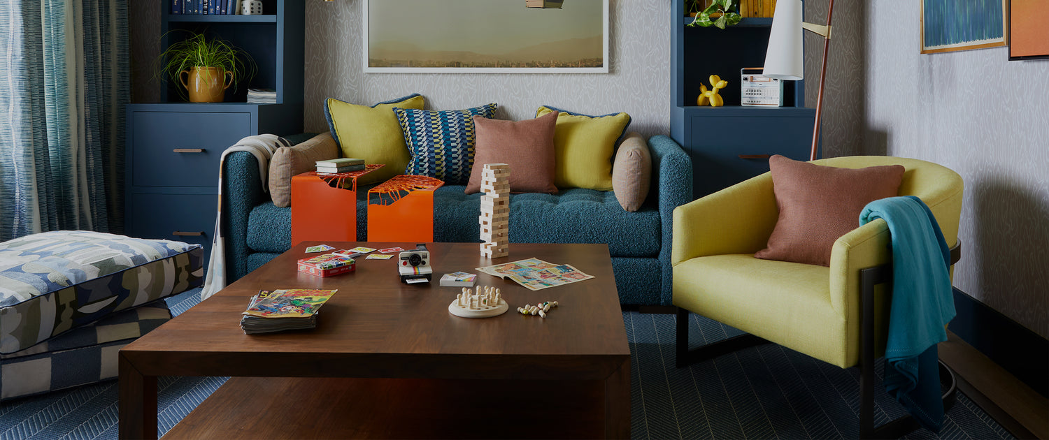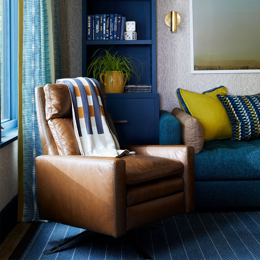 - Furnishings should sit partially or completely on the rug, while still allowing ample space to move in and out of the area. This usually means allowing 18”-24” of space between sofa and chairs or sofa and coffee table.