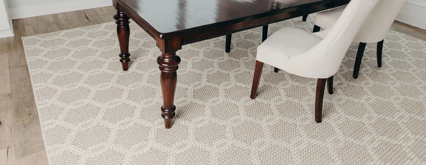 - The perfect size rug will allow the chairs to be accessed while all four legs stay on the rug. Depending on the scale of the chairs, 24”-36” of rug beyond the edges of the table is recommended.