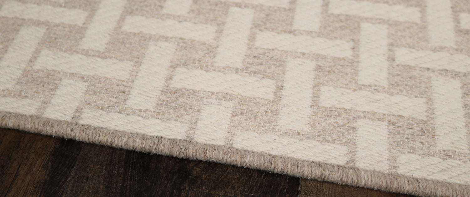 The Olina Collection showcases a geometric pattern reminiscent of ancient columns. Made of 100% wool and available in four neutral colorways that will stand the test of time.