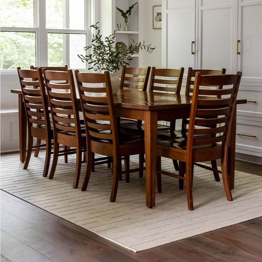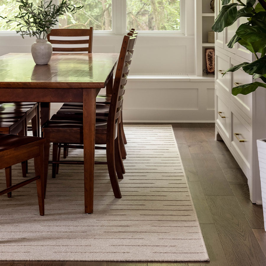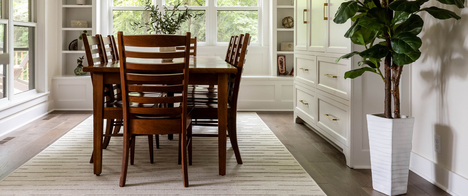 - The perfect size rug will allow the chairs to be accessed while all four legs stay on the rug. Depending on the scale of the chairs, 24”-36” of rug beyond the edges of the table is recommended.