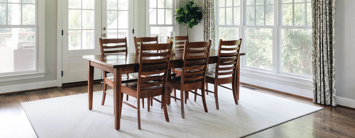 - The perfect size rug will allow the chairs to be accessed while all four legs stay on the rug. Depending on the scale of the chairs, 24”-36” of rug beyond the edges of the table is recommended.