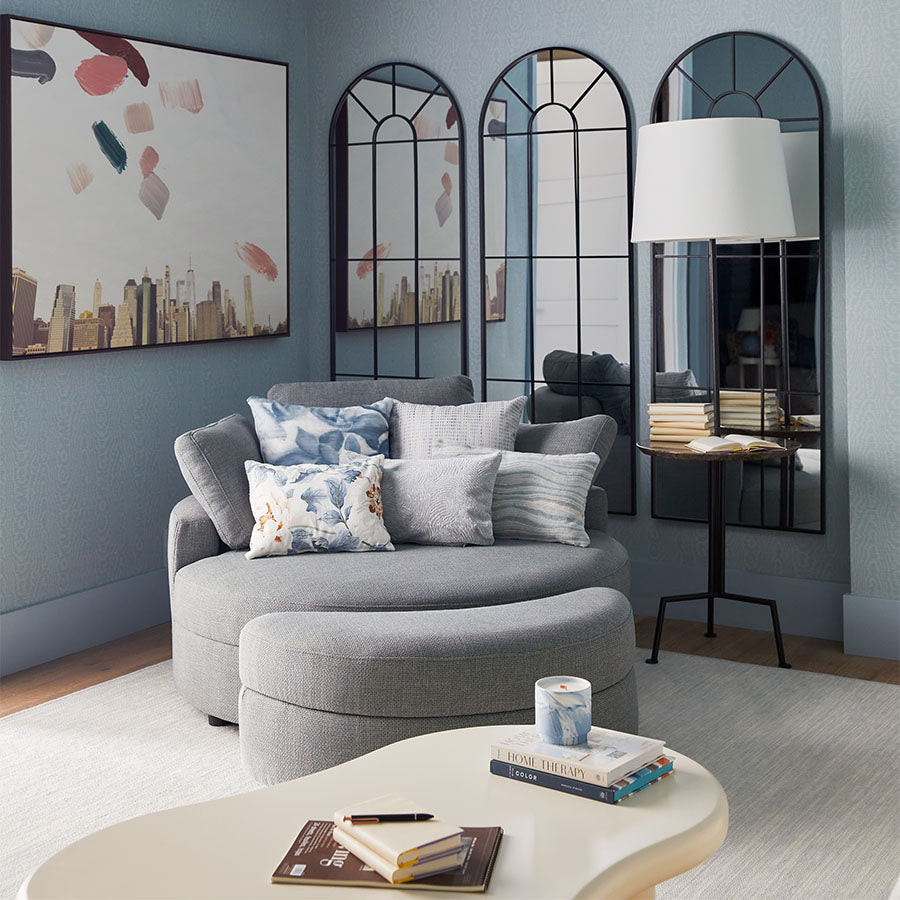 • Furnishings should sit partially or completely on the rug, while still allowing ample space to move in and out of the area. This usually means allowing 18”-24” of space between sofa and chairs or sofa and coffee table.