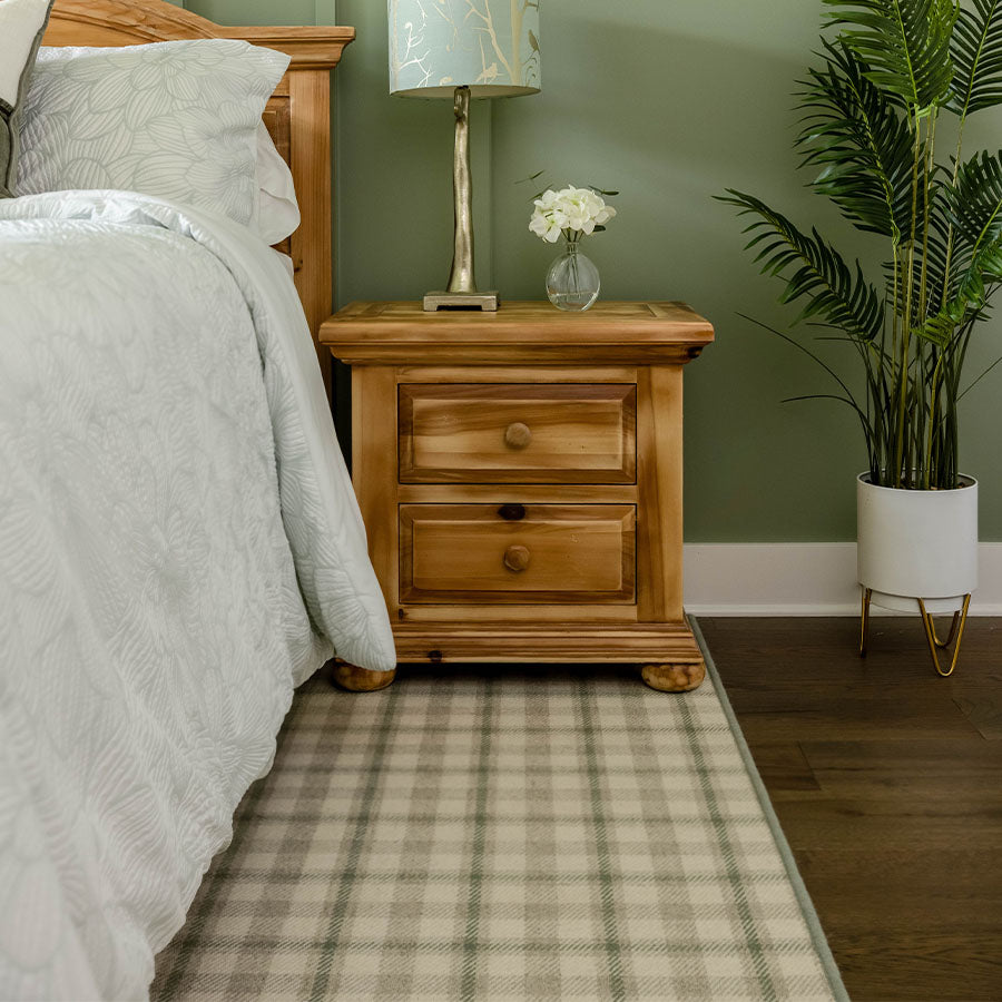 - Place the rug under at least 2/3 of the bed and allow the rug to cover 30”-36” on each side and the foot of the bed.
