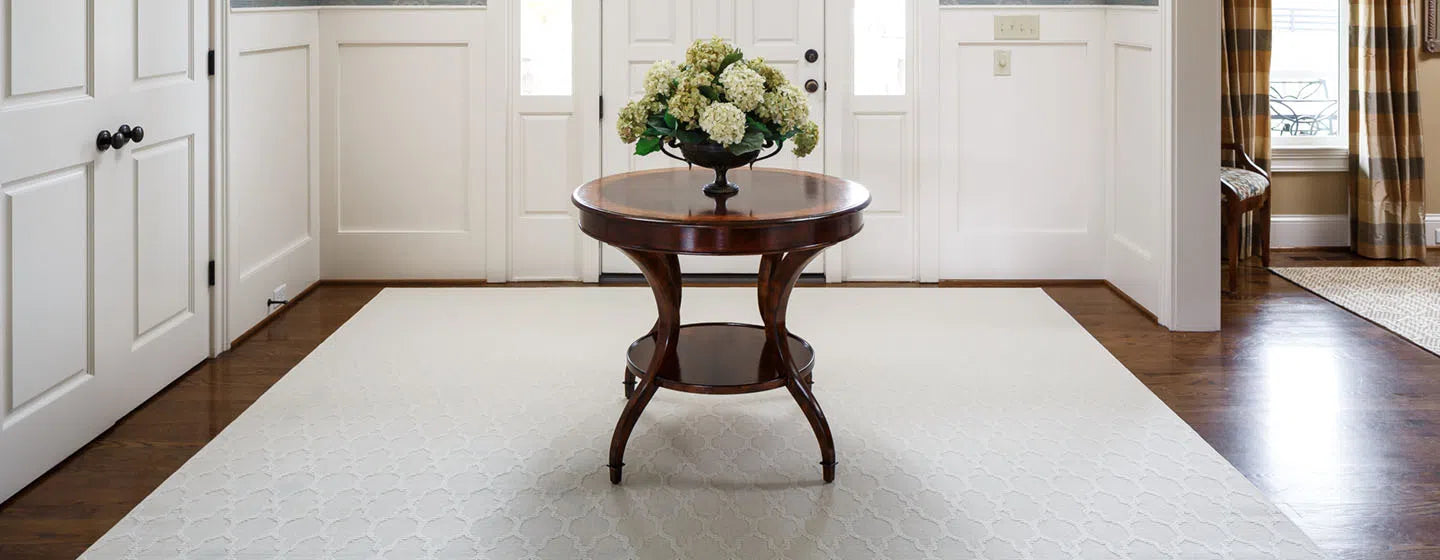 - Most entryway rugs allow for 18” of bare floor between rug and walls. Smaller entryways are limited to the width of the door.