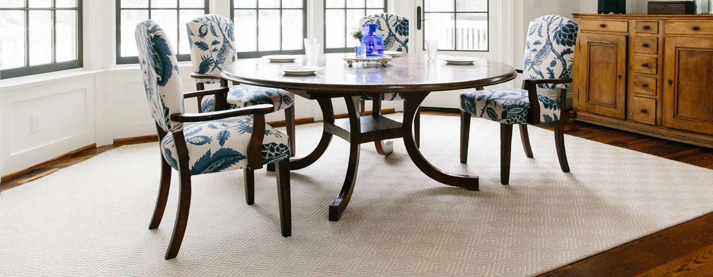 - The perfect size rug will allow the chairs to be accessed while all four legs stay on the rug. Depending on the scale of the chairs, 24”-36” of rug beyond the edges of the table is recommended.
