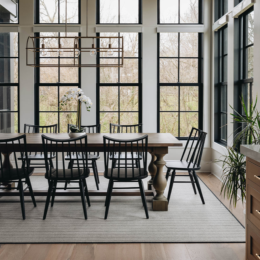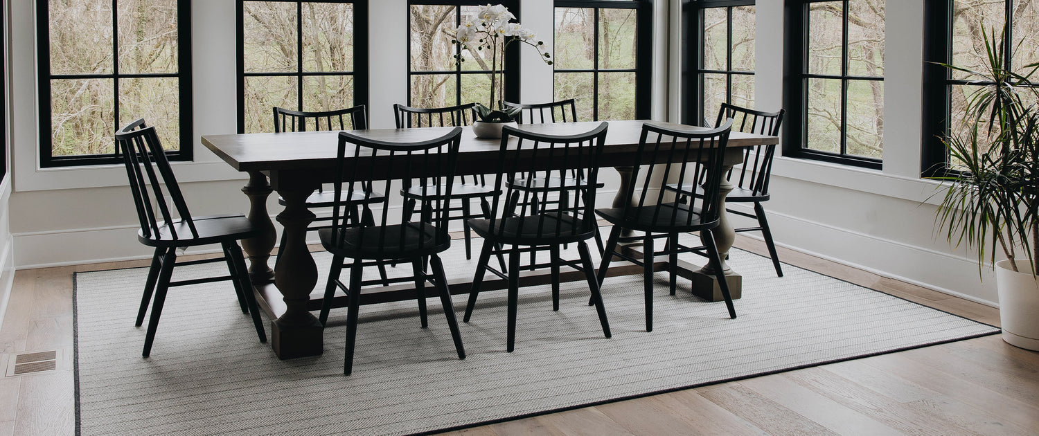 - The perfect size rug will allow the chairs to be accessed while all four legs stay on the rug. Depending on the scale of the chairs, 24”-36” of rug beyond the edges of the table is recommended.