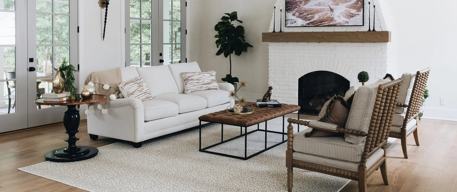 - Furnishings should sit partially or completely on the rug, while still allowing ample space to move in and out of the area. This usually means allowing 18”-24” of space between sofa and chairs or sofa and coffee table.